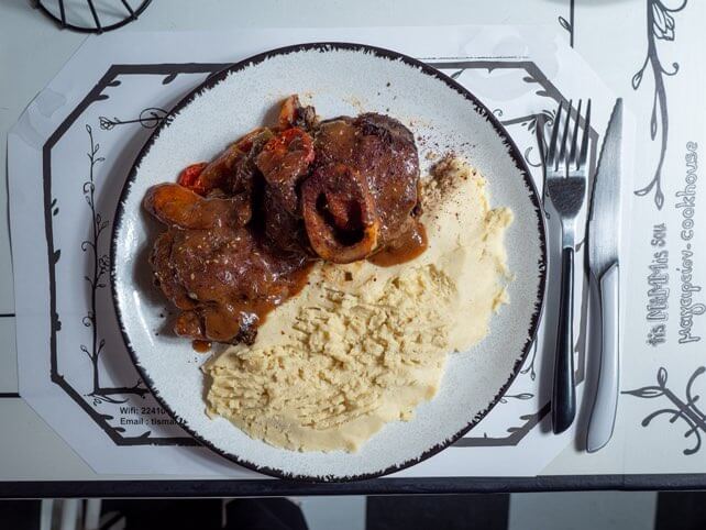 Μοσχαρίσιο κότσι γάλακτος σιγοψημένο με λαχανικά. Συνοδεύεται από γαρνιτούρα της επιλογής σας
